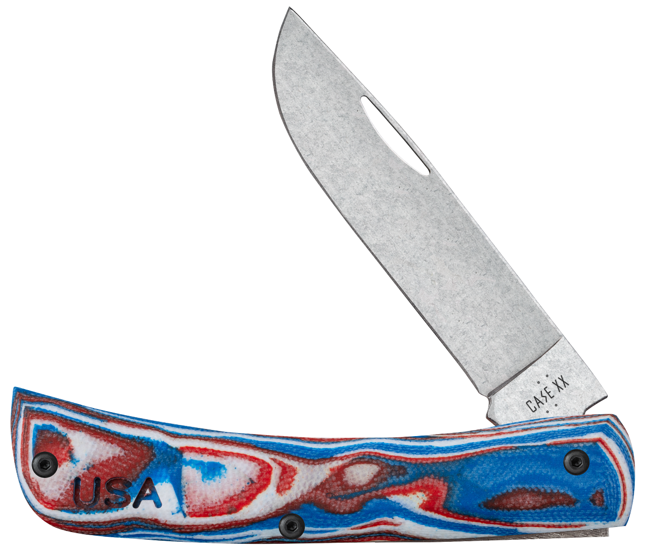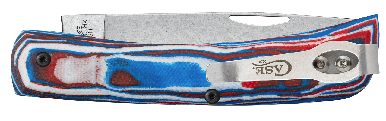 The handle is smooth Red, White & Blue Burl G10 with removeable, right-carry tip-up pocket clip and engraved with USA.